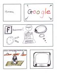 Returning to the examples from Liverpool above, it seems clear that they could be analysed from a strictly semiotic point of view. What signs and signifiers are present? How are they structured on the page? What is the relationship between image and text? However, I suspect for my case study this would miss the main question; How do people represent their browser history in visual narrative form? While semiotic (multimodal) analysis will form the basis of my approach the materials will be seen through the lens of my research question in order to inform a practical design process rather than finite texts in themselves. They are contributive to a larger process of design production and should be considered in that context.