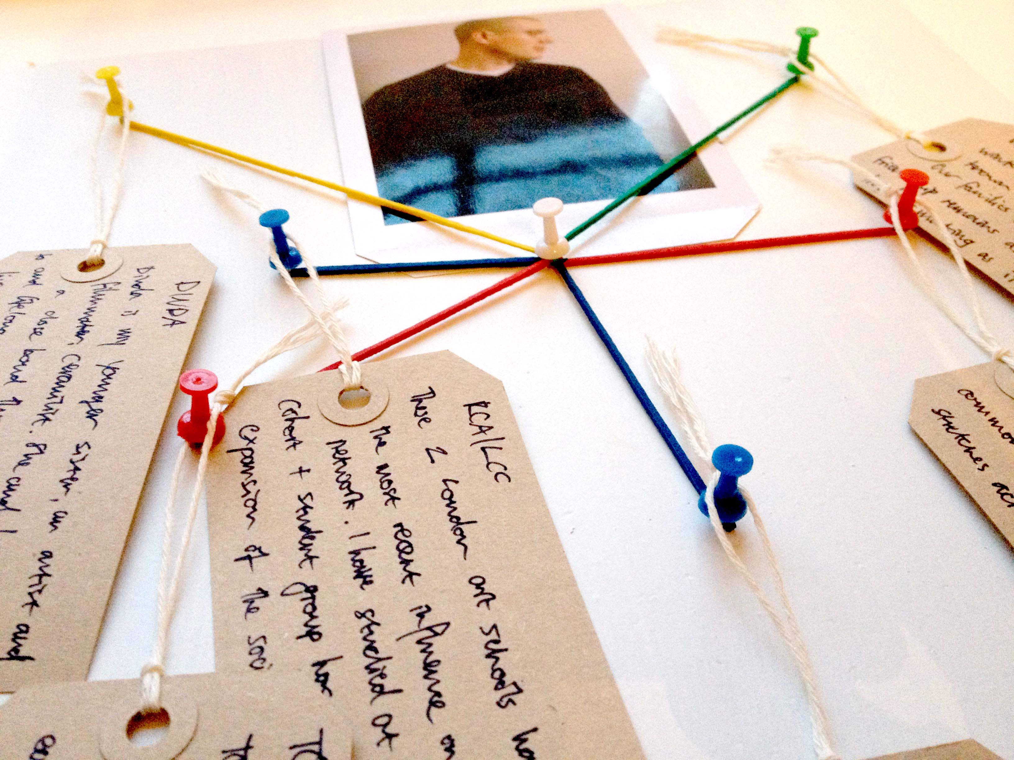 Starting tomorrow I’ll be running two days of field research in Elephant and Castle. We’ll be making tangible, physical models of our social connections out of simple materials with the intention of building up a picture of human relationships. Each person will get a tile and will be asked to stick coloured pins into it representing six people in their network. These pins will be connected by coloured elastic. People will then write short accounts or stories of how they know each person. The physical artefact is a vector pr proxy for the externalisation of individual social networks. Six connections are chosen as representing what Robin Dunbar has discovered is the maximum number of close relationships the human brain has evolved to manage. Dunbar describes humans as being uniquely capable of third order intentionality and above,which allows us to mirror the mind state of others thus giving rise to social life and friend groups.
