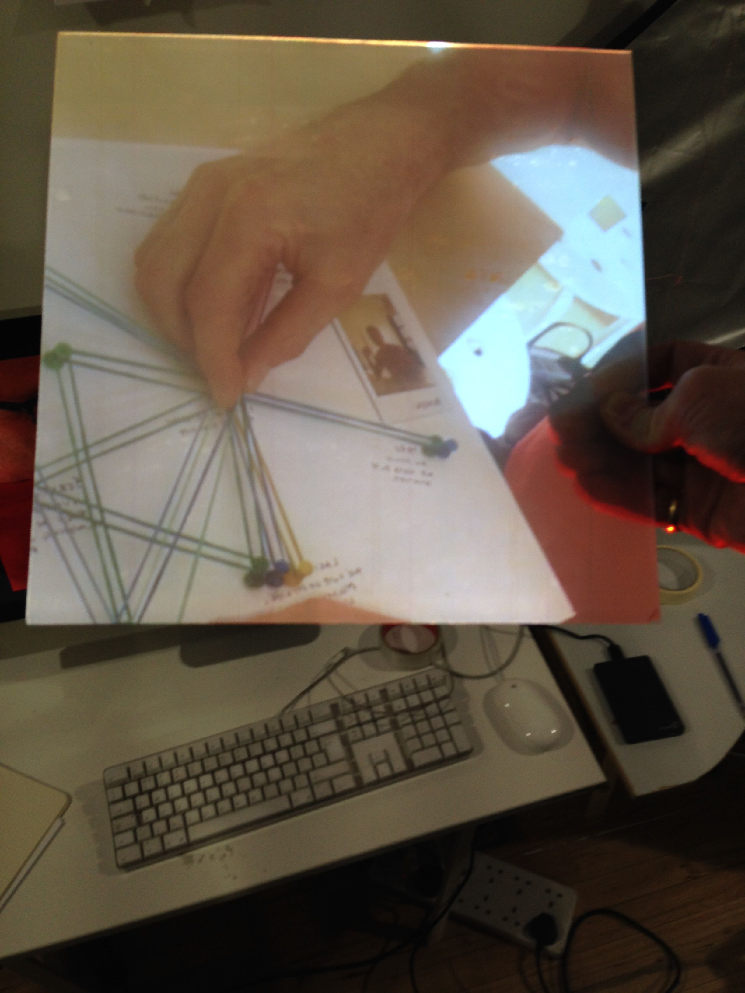For last week’s work in progress show, working with Shobhan Shah, I put together an interactive installation that was designed to be a digital/physical video player. The basic idea is that the nodes in a network become buttons that trigger video footage of someone talking about the particular relationship represented by that node. So as you press on the buttons wether in a specific sequence or not you get the story of a specific social network. This gets at some important elements of my research – that social networks embody the very human qualities of personal relationships and that one important way of understanding these relationships is by recounting or telling stories about them. In order to view the video it needed to be back projected – you can’t stick physical pins into a monitor. It was important to me that the proportions of the network substrate were identical to the original. I sourced some frosted perspex and pointed a Pico projector at it to find out what the minimum projection distance would be to achieve the image size required. This distance then dictated the height of the resulting plinth on top of which the perspex sheet sat. The next challenge was to drill holes in the perspex sheet in the same configuration as the original tile, stick buttons behind the holes and mount cork plugs robust enough to hold a coloured push pin in place but still allow for the detent on the button beneath.