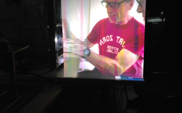 Of course we soon discovered that back projecting an image onto a sheet of plastic has focus issues. The projected light passes through the lower surface but is diffused by the frost in the centre to result in a soft image on the front surface. We never discovered the workaround to this problem but my colleague Michaela French came up with a brilliant solution. For her own exhibit she projected onto small sheets of transparent perspex that had only one surface frosted by laser cutting a shallow engrave over the entire surface. Great thinking through materials and a real why-didn’t-we-think-of-that? moment. All our buttons had to be connected to an Arduino at floor level 1 metre away in order to interface with a mac mini hidden in the base of the plinth. The issue then became how to stop the wires from creating sharp shadows on the image. After much fiddling and sticking eventually we got all the wires out of the way and stretching away internally down to the base of the plinth. The final setup was then a projector mounted at floor level, pointing upwards to a projection surface which had back mounted buttons onto which brass tubes containing cork plug were glued. These mounted into the perspex such that they were flush with the upper surface. Of course back projected images are reversed so we had to fix that and make sure the entire surface was covered by the projected image not leaving any black borders or misaligned videos.