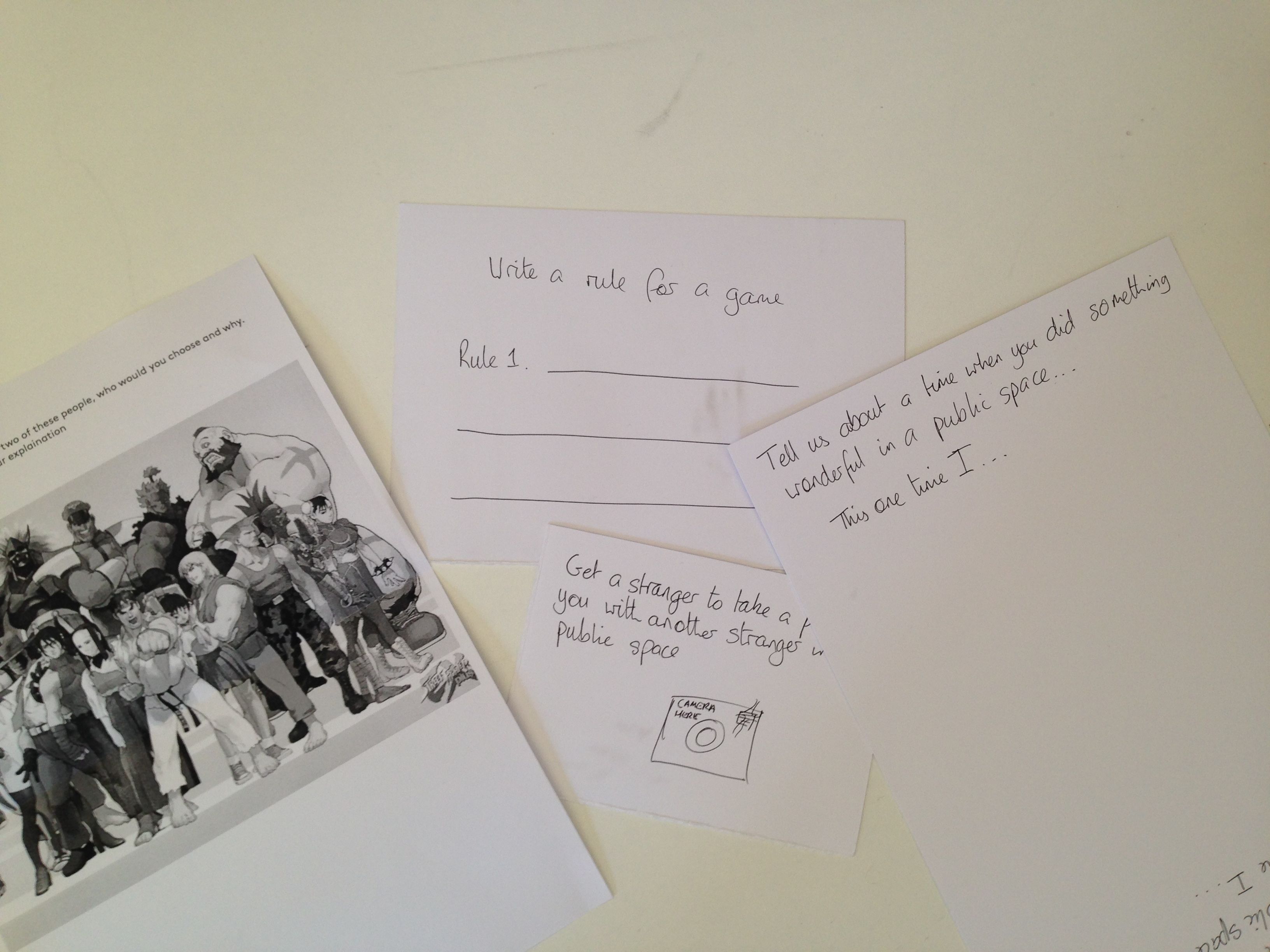 This probe is intended to uncover some responses related to the playing of computer games in public. It is pitched more explicitly as a set of instructions related to game playing and includes the delightful task of explaining which computer game avatar you would go for a drink with and why. Again, simple, playful, accessible.