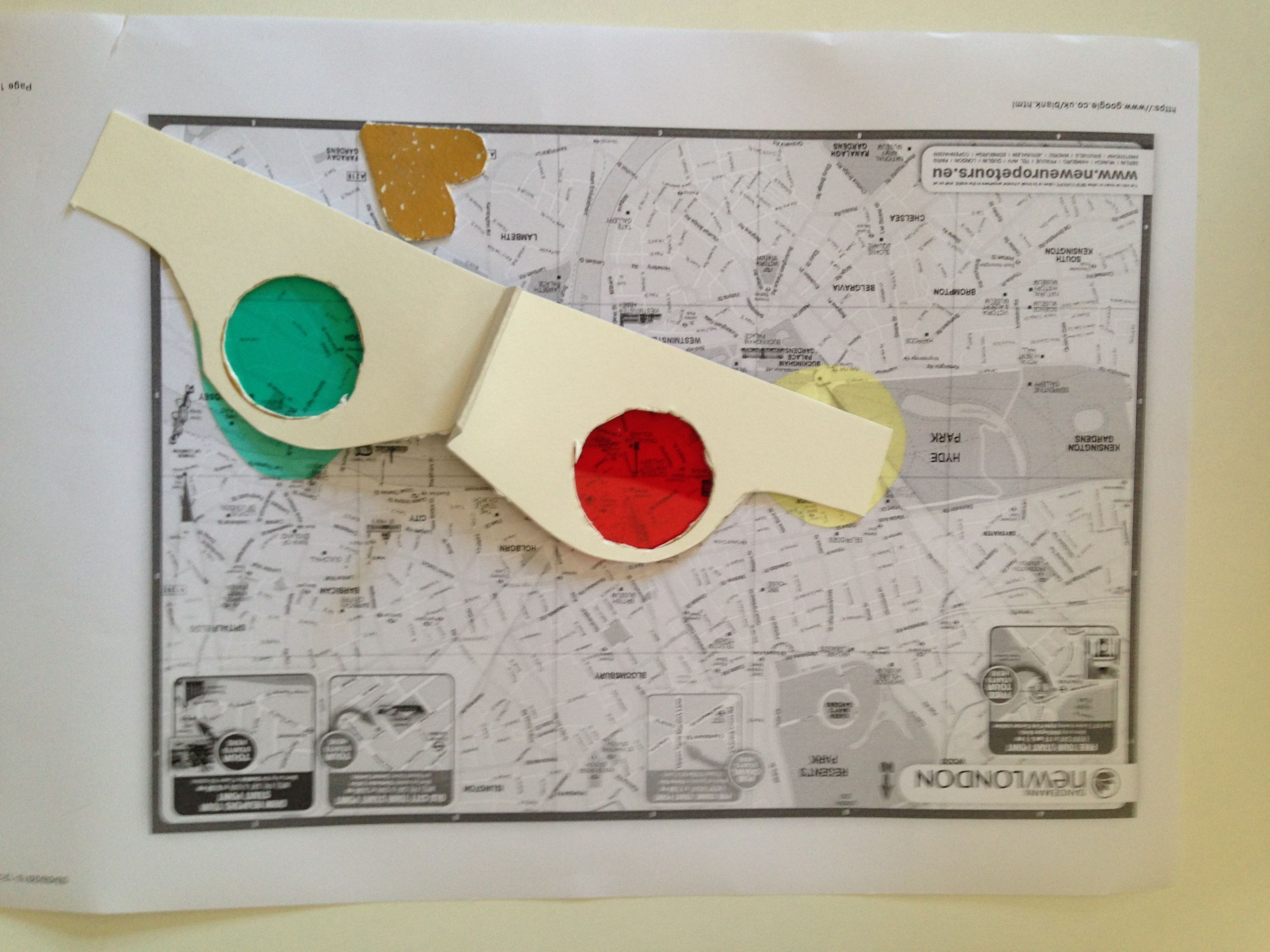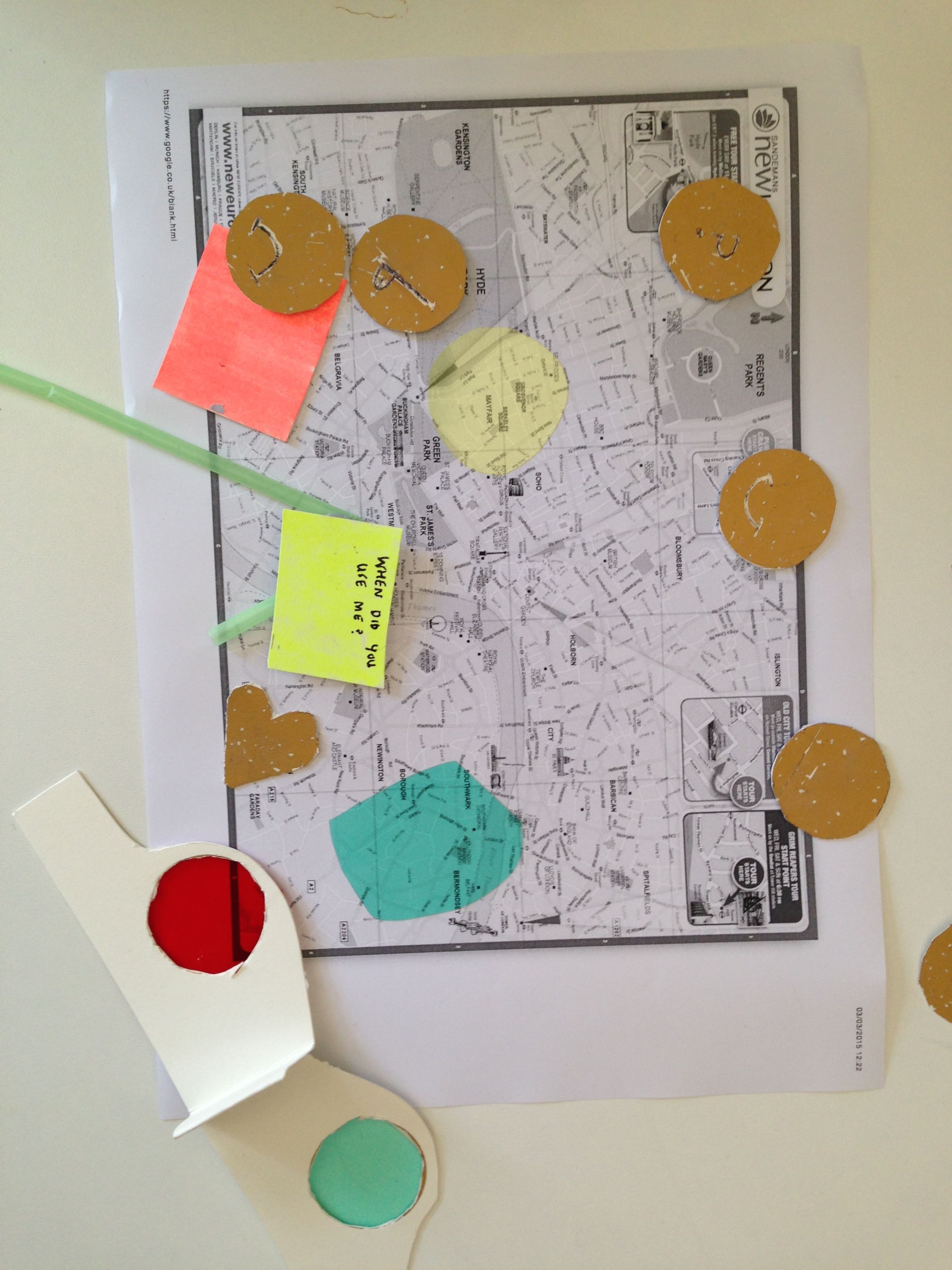 Responding to the same brief, this map of London uses 3D glasses, stickers, and coloured plastic film to annotate map of London as you search for somewhere to live. Maps have been used in Cultural probes since Gaver et al’s original kit in 1997 and I really like the different modes of annotation provided here.