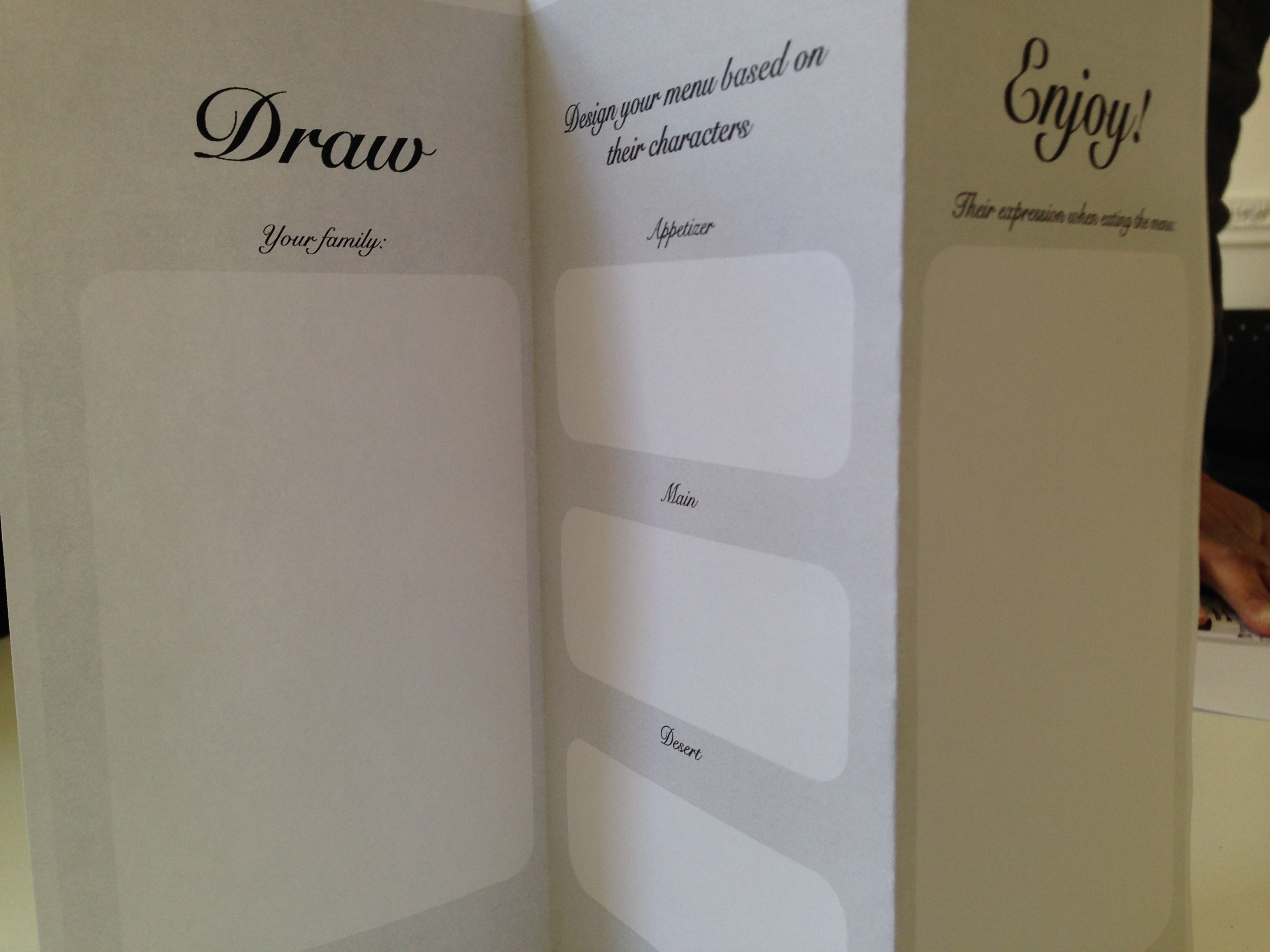 A cultural probe exploring the social meaning of cooking for family members produced this folded menu-like leaflet. Tasks involve drawing people, design a menu based on personality and recording responses as people eat together. Although the form of this probe is very simple, easy to produce and accessible the tasks it requires would produce some richly textured information.