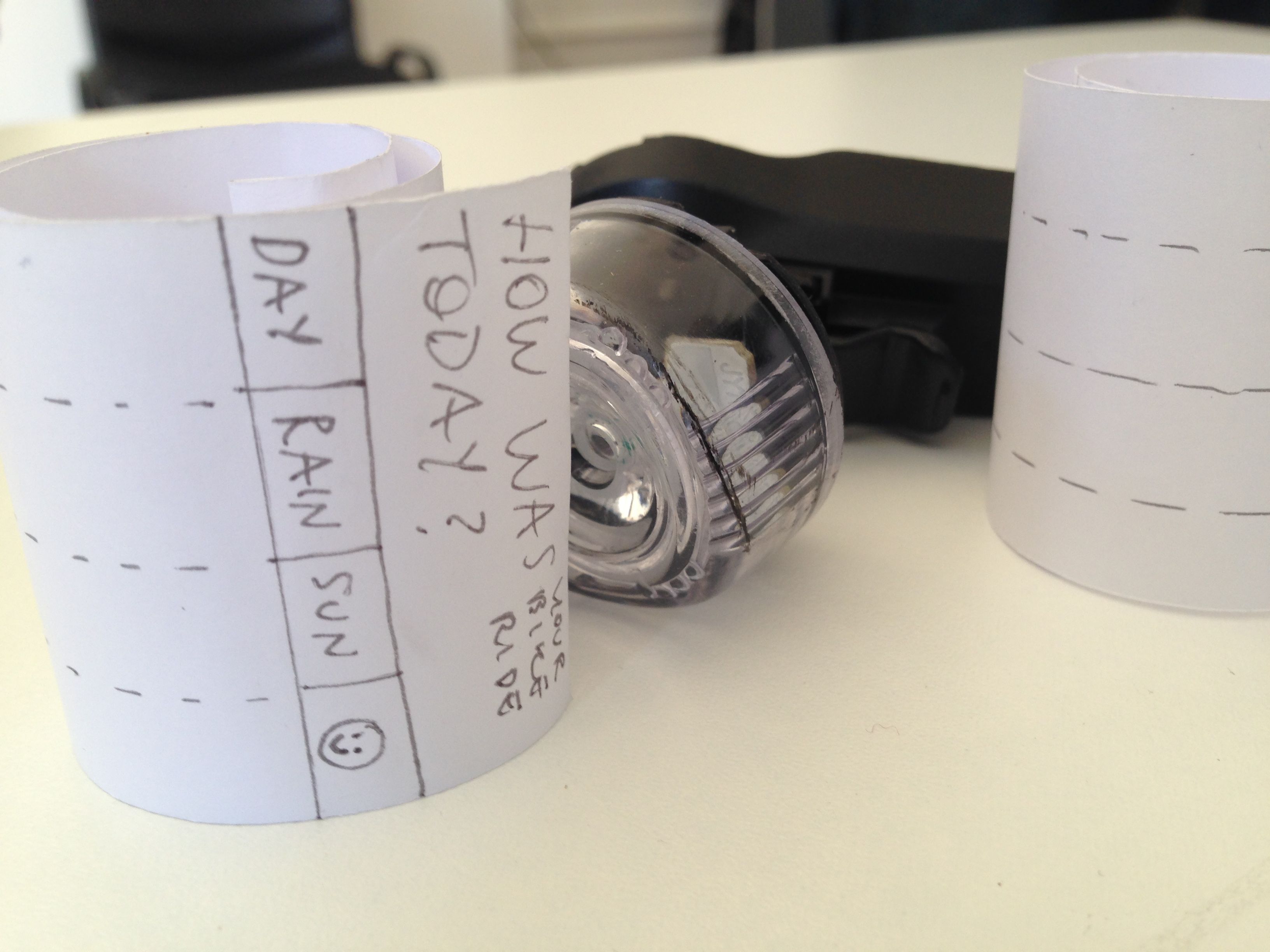 Finally, Lorenzo Pradelli made this elegant probe to elicit data about cycling in London. Although not strictly a cultural probe since it is a quantitative data gathering instrument, it is a great design. The questionnaire sheets are wrapped around the bike light batteries meaning they do not work. The cyclist opens them up in frustration and finds the paper scrolls asking for written information.
