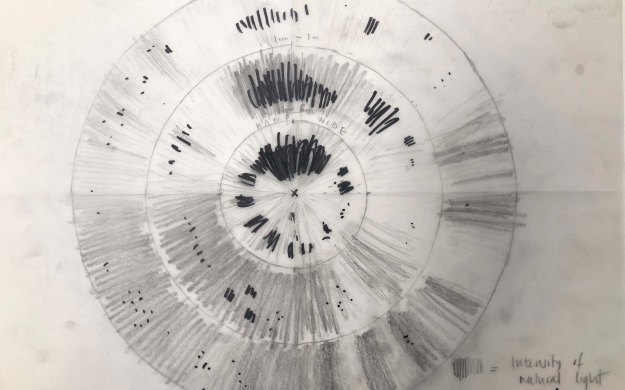 Claudia Soler Bernardini made a circular plot of the various light levels in Westfield. An inner ring shows the immediate personal context, the middle ring out to an approximate distance of ten metres, the final ring shows light levels over the whole centre.